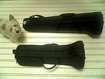 手前がアルト、奥がバストロのケースです。いやー短いですねー。でもなぜか幅はこっちのがズングリですね〜。でもシッカリしてるし小物も結構入るし楽器が元々小さいのでチョー軽いです。満足満足。それに奥さん、チョー激安です。樋口さんで買えちゃいます。こりゃアナタ、買うしかないアルヨー。ってもアルトトロンボーン自体普通必要ないか・・・。